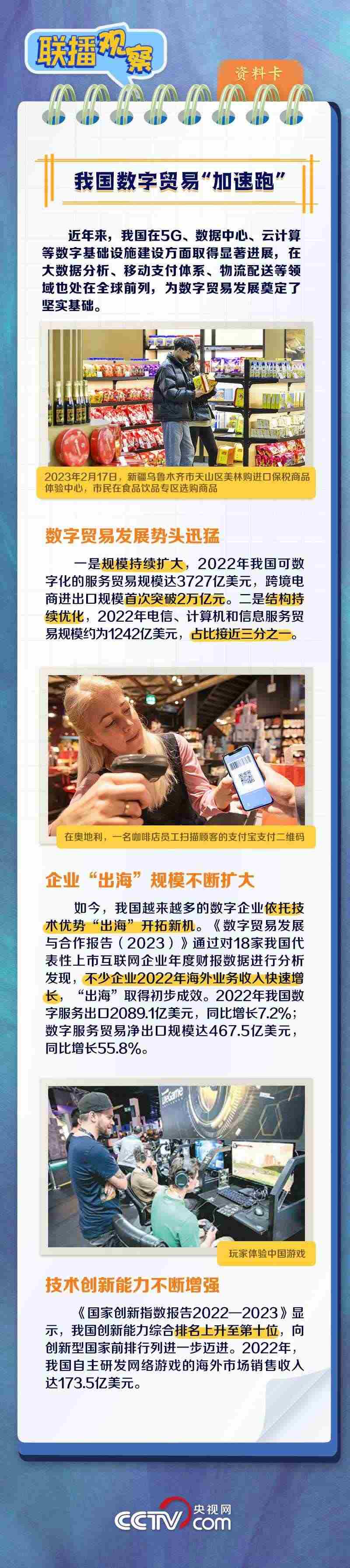 當(dāng)前,貨物貿(mào)易和服務(wù)貿(mào)易都呈現(xiàn)出不可逆的數(shù)字化轉(zhuǎn)型趨勢(shì)。什么是數(shù)字貿(mào)易?本屆數(shù)貿(mào)會(huì)有什么看點(diǎn)和亮點(diǎn)?我國(guó)數(shù)字貿(mào)易有何發(fā)展成果?央視網(wǎng)《聯(lián)播觀察》與您一同了解。