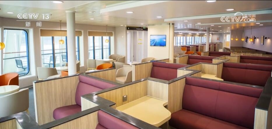 不僅操作靈巧、動力強勁,船上還為旅客提供了游戲區(qū)、兒童區(qū)、餐飲區(qū)等超過1萬平方米的公共活動區(qū)域。通過建立完整的產(chǎn)業(yè)鏈,內裝方面已實現(xiàn)了從設計、制造、安裝全過程100%國產(chǎn)化。