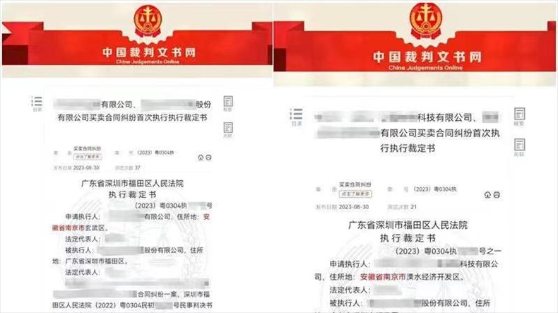·深圳市福田區(qū)人民法院的兩份執(zhí)行裁定書將江蘇南京錯寫成“安徽省南京市”,已從裁判文書網(wǎng)撤下。