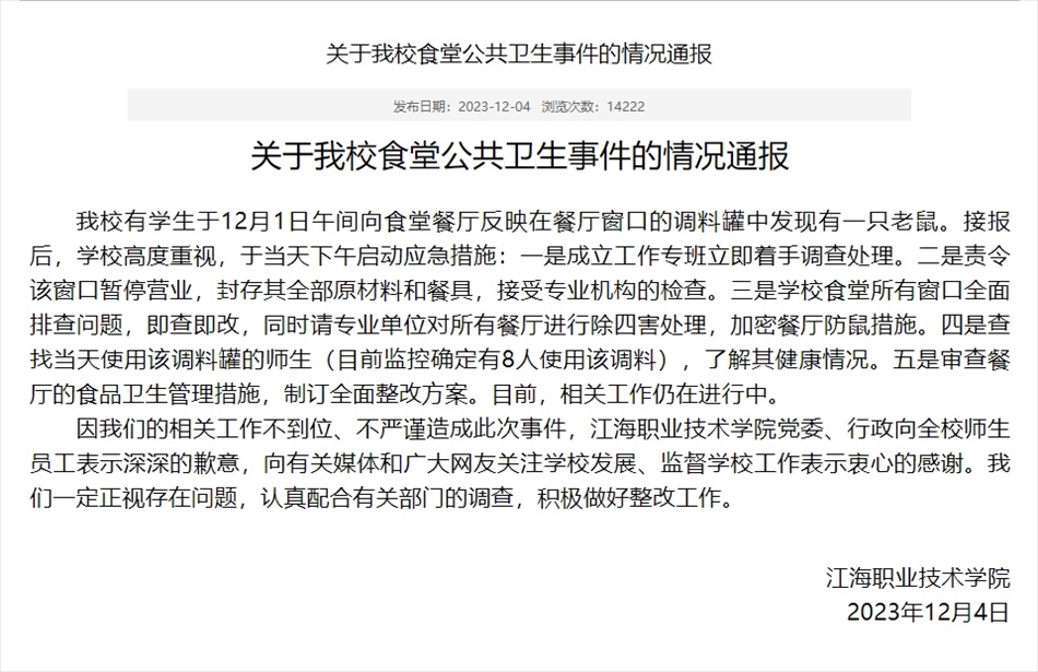·揚州一高校通報食堂麻醬罐發(fā)現(xiàn)老鼠:成立專班調(diào)查處理,涉事窗口停業(yè)。