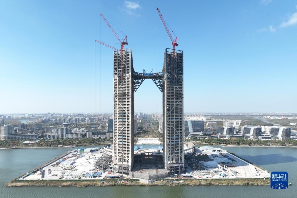 這是鋼結構錐體提升完成的西島中銀金融中心項目南北塔樓(2023年11月24日攝,無人機照片)。新華社記者 方喆 攝
