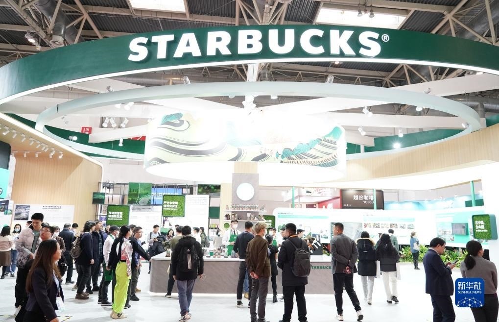 這是在首屆中國國際供應鏈促進博覽會健康生活鏈展區(qū)拍攝的星巴克展位(2023年11月28日攝)。新華社記者 任超 攝