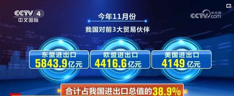 同時(shí),對(duì)部分傳統(tǒng)市場(chǎng)貿(mào)易也出現(xiàn)積極變化。我國(guó)對(duì)前三大貿(mào)易伙伴東盟、歐盟、美國(guó)分別進(jìn)出口5843.9億元、4416.6億元、4149億元,合計(jì)占我國(guó)進(jìn)出口總值的38.9%。11月當(dāng)月,中美貨物貿(mào)易同比增長(zhǎng)2.7%,結(jié)束連續(xù)6個(gè)月的同比下降,環(huán)比增長(zhǎng)4.3%。