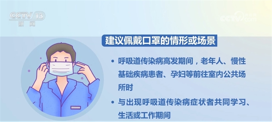 《指引》明確,應(yīng)佩戴口罩的情形或場(chǎng)景包括:新冠病毒感染、流感、肺炎支原體感染、呼吸道合胞病毒感染等呼吸道傳染病感染者前往室內(nèi)公共場(chǎng)所或與他人近距離接觸時(shí)。出現(xiàn)發(fā)熱、咳嗽、流涕、咽痛、肌肉酸痛、乏力等呼吸道傳染病癥狀者前往室內(nèi)公共場(chǎng)所或與他人近距離接觸時(shí)。前往醫(yī)療機(jī)構(gòu)就診、陪診、陪護(hù)、探視時(shí)。呼吸道傳染病高發(fā)期間,外來(lái)人員進(jìn)入養(yǎng)老機(jī)構(gòu)、社會(huì)福利機(jī)構(gòu)、托幼機(jī)構(gòu)等脆弱人群集中場(chǎng)所時(shí)。呼吸道傳染病高發(fā)期間,養(yǎng)老機(jī)構(gòu)、托幼機(jī)構(gòu)、學(xué)校等重點(diǎn)機(jī)構(gòu)的醫(yī)護(hù)、餐飲、保潔、保安等公共服務(wù)人員工作期間。