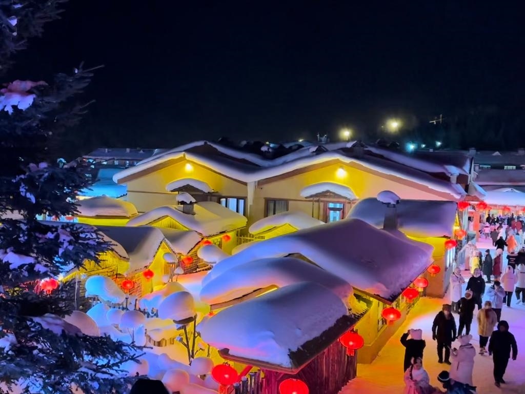 在位于長白山脈張廣才嶺與老爺嶺交會處的黑龍江“中國雪鄉(xiāng)”景區(qū),游客熙熙攘攘、絡繹不絕。3000余盞大紅燈籠懸掛在棧道、房檐上,火紅的燈籠映襯著潔白的“雪蘑菇”“雪蛋糕”“雪舌”等獨特雪景,宛如童話世界。