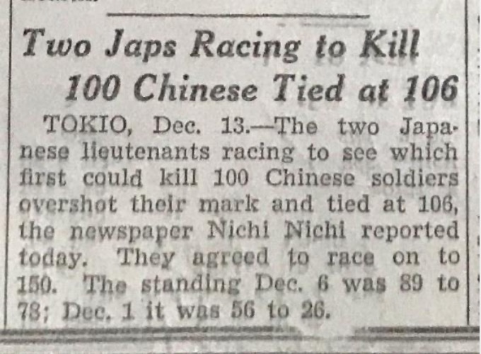 “根據(jù)《東京日日新聞》報道,兩名日本軍官比賽看誰能先殺死100名中國士兵,結果都殺了超過100人,雙方打平殺了106人,他們又同意重新比賽殺到150人為止,12月6日是89比78,12月1日是56比26?!边@是1937年12月14日發(fā)行的《芝加哥每日論壇》中,一篇有關兩名日本軍官進行“百人斬”殺人競賽的報道節(jié)選。