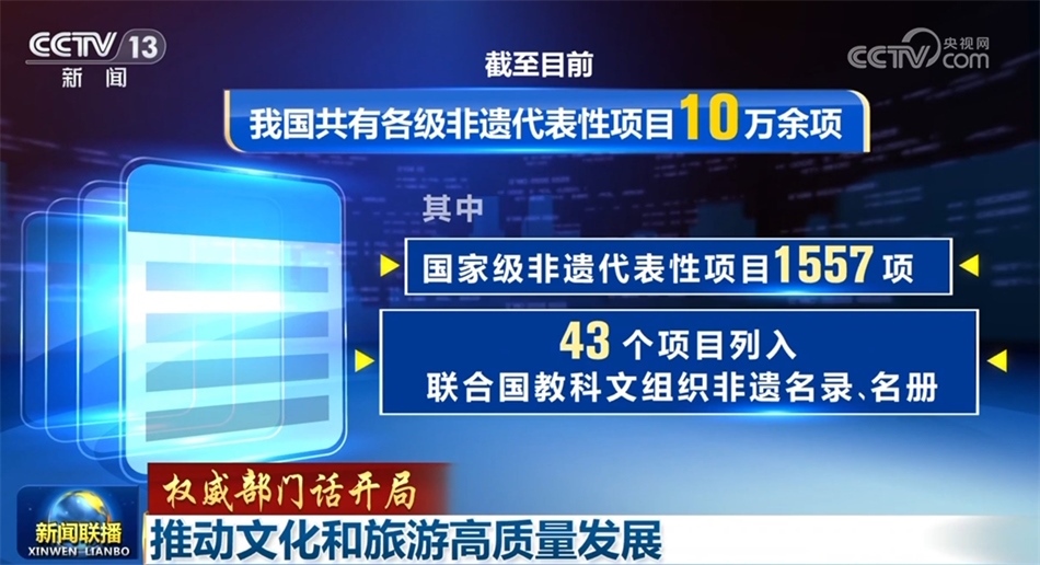繁榮發(fā)展文化事業(yè)和文化產(chǎn)業(yè),推進(jìn)城鄉(xiāng)公共文化服務(wù)體系提質(zhì)增效。今年前11個(gè)月,文化和旅游部主辦27項(xiàng)展演展示活動(dòng),線下觀眾90萬人次,線上觀看量超過18億次,一批彰顯中華審美風(fēng)范、富有鮮明時(shí)代氣息的舞臺(tái)藝術(shù)作品廣受好評(píng)。保護(hù)傳承弘揚(yáng)中華優(yōu)秀傳統(tǒng)文化,中華文明探源工程、考古中國(guó)等重大項(xiàng)目得以深入實(shí)施,截至目前,我國(guó)共有各級(jí)非遺代表性項(xiàng)目10萬余項(xiàng),其中國(guó)家級(jí)非遺代表性項(xiàng)目1557項(xiàng),43個(gè)項(xiàng)目列入聯(lián)合國(guó)教科文組織非遺名錄(名冊(cè)),中國(guó)世界遺產(chǎn)數(shù)量增至57項(xiàng)。