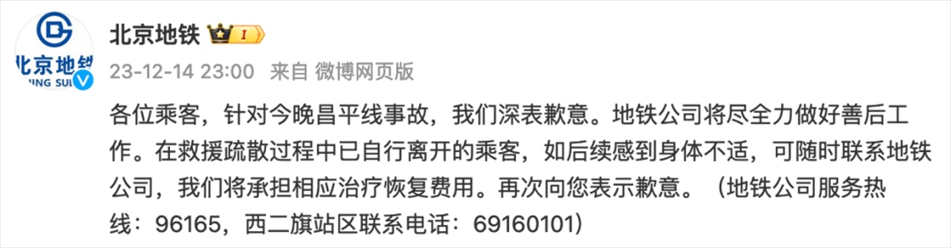 ·12月14日晚,北京地鐵昌平線事故導致30余人受傷,無人員死亡。北京地鐵發(fā)布微博致歉:將承擔相應治療恢復費用。