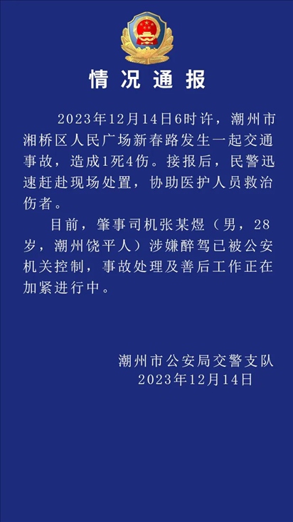 ·廣東潮州一男子涉嫌醉駕致1死4傷,警方通報:肇事司機已被控制。