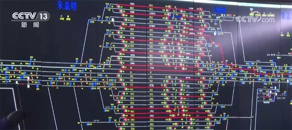 總臺(tái)央視記者 張叢婧:我現(xiàn)在是來(lái)到了車(chē)站的行車(chē)指揮室,可以看到這塊大屏幕上實(shí)時(shí)顯示著車(chē)站的列車(chē)狀態(tài),中間這些紅色的線就代表著此時(shí)軌道上正在有列車(chē)作業(yè)或者等待作業(yè),左邊這些紅色線就意味著現(xiàn)在有列車(chē)正在進(jìn)站。
