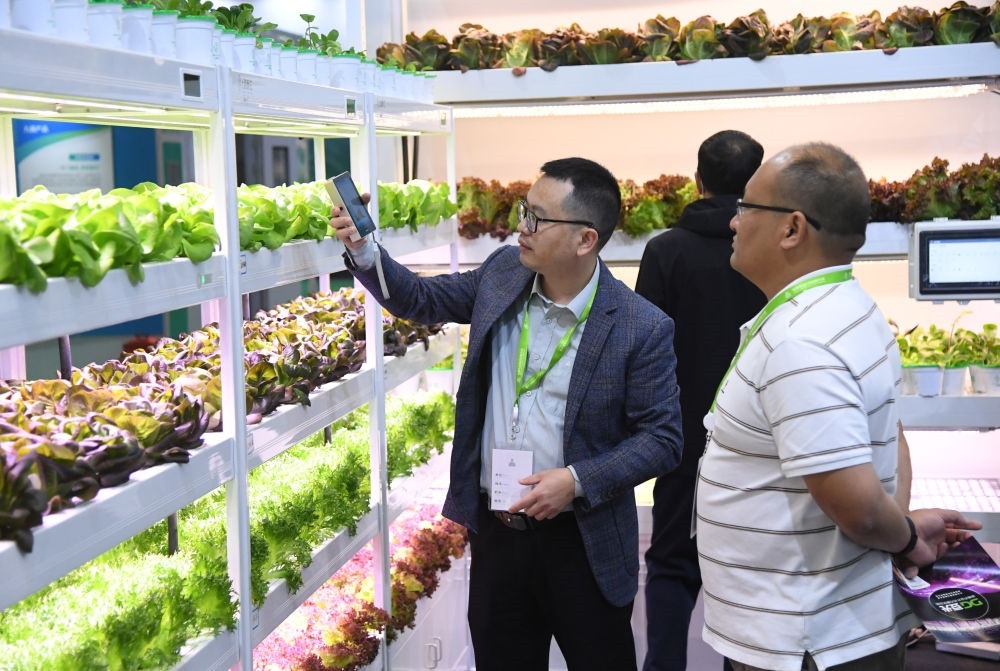 2023世界農業(yè)科技創(chuàng)新大會11月2日至4日在北京舉行。這是2023年11月2日,工作人員(左)在世界農業(yè)科技博覽會現(xiàn)場介紹智慧植物工廠。新華社記者 任超 攝