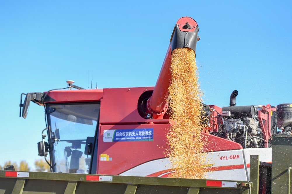 在中國科學院“黑土糧倉”科技會戰(zhàn)長春示范區(qū)公主嶺示范基地,無人駕駛農機將收獲的玉米裝車(2023年10月19日攝)。新華社記者 張楠 攝