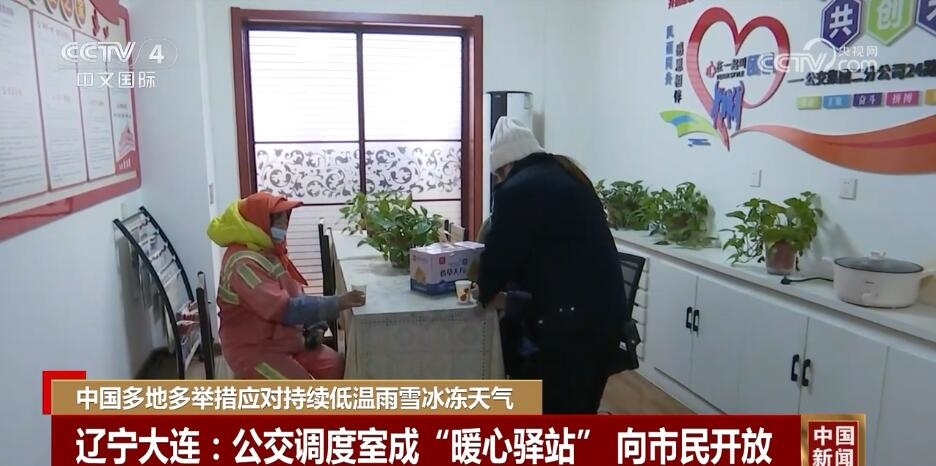 在遼寧大連,嚴(yán)寒天氣下,一些臨近居民區(qū)、菜市場(chǎng)、商業(yè)區(qū)的公交調(diào)度室臨時(shí)向市民開放,供路過市民歇腳、暖身。
