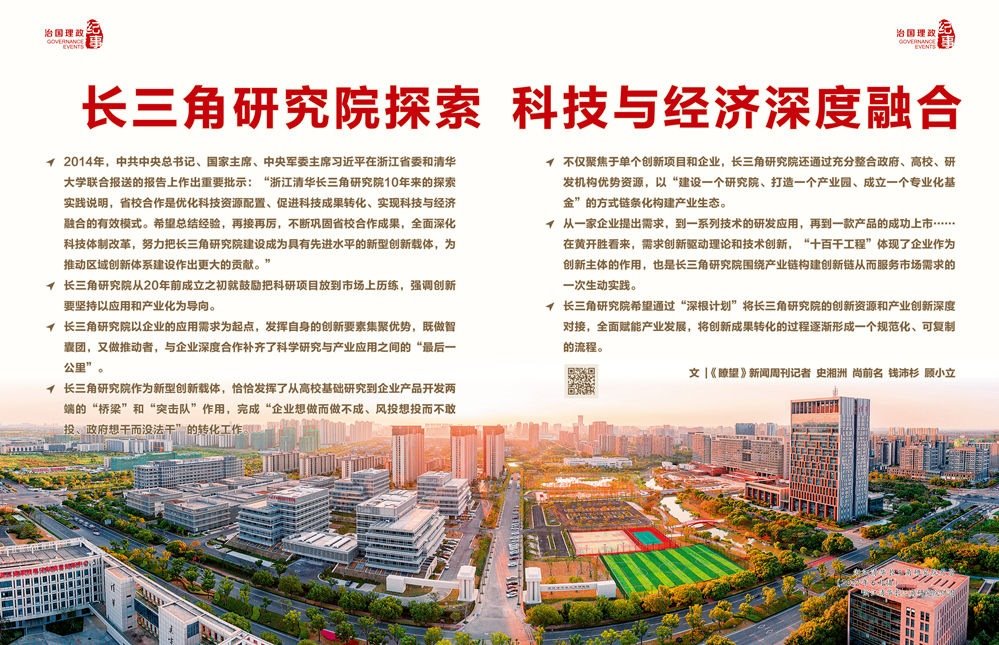 2003年底,在時(shí)任浙江省委書記習(xí)近平的親自推動下,浙江清華長三角研究院(以下簡稱“長三角研究院”)正式成立,落地浙江嘉興。作為浙江省人民政府與清華大學(xué)共建的新型創(chuàng)新載體,長三角研究院成立以來立足浙江、面向長三角,以自收自支、市場化運(yùn)營探索走出一條省校合作的有效模式,逐步成長為長三角區(qū)域重要的產(chǎn)學(xué)研試驗(yàn)平臺和成果轉(zhuǎn)化基地。