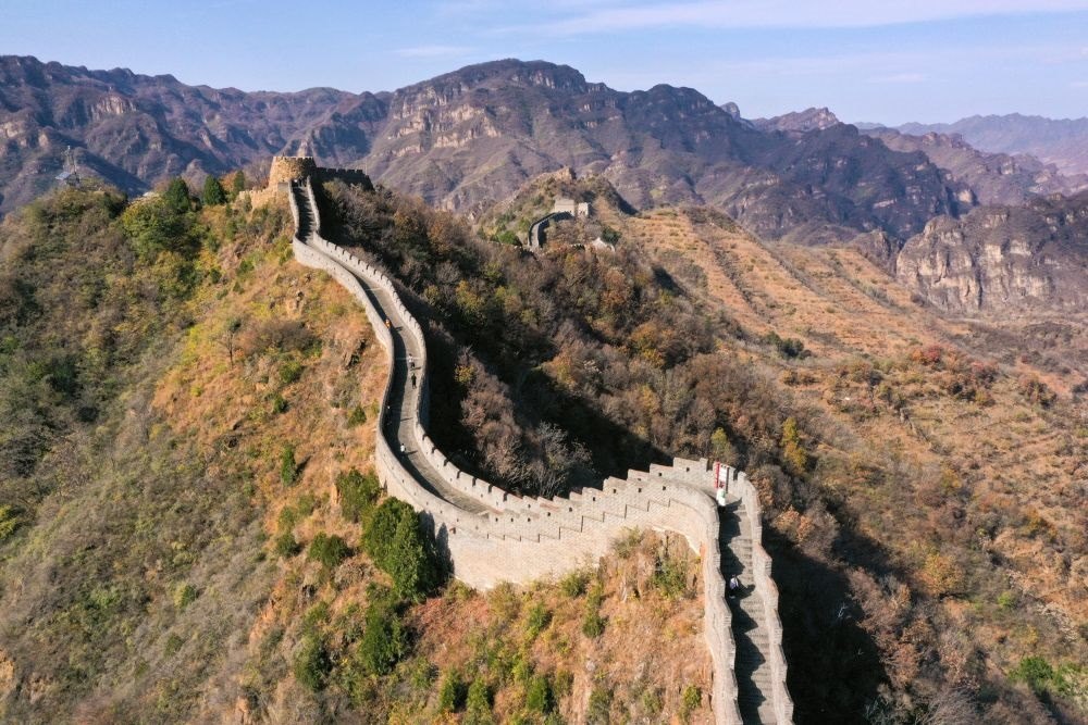 這是在天津市薊州區(qū)拍攝的黃崖關(guān)長城太平寨段秋景(無人機(jī)照片,2023年11月6日攝)。