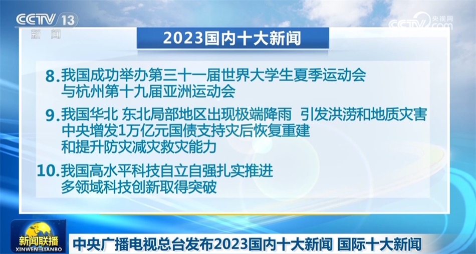 央視網(wǎng)消息(新聞聯(lián)播):中央廣播電視總臺(tái)今天(12月27日)發(fā)布2023國(guó)內(nèi)十大新聞和國(guó)際十大新聞。