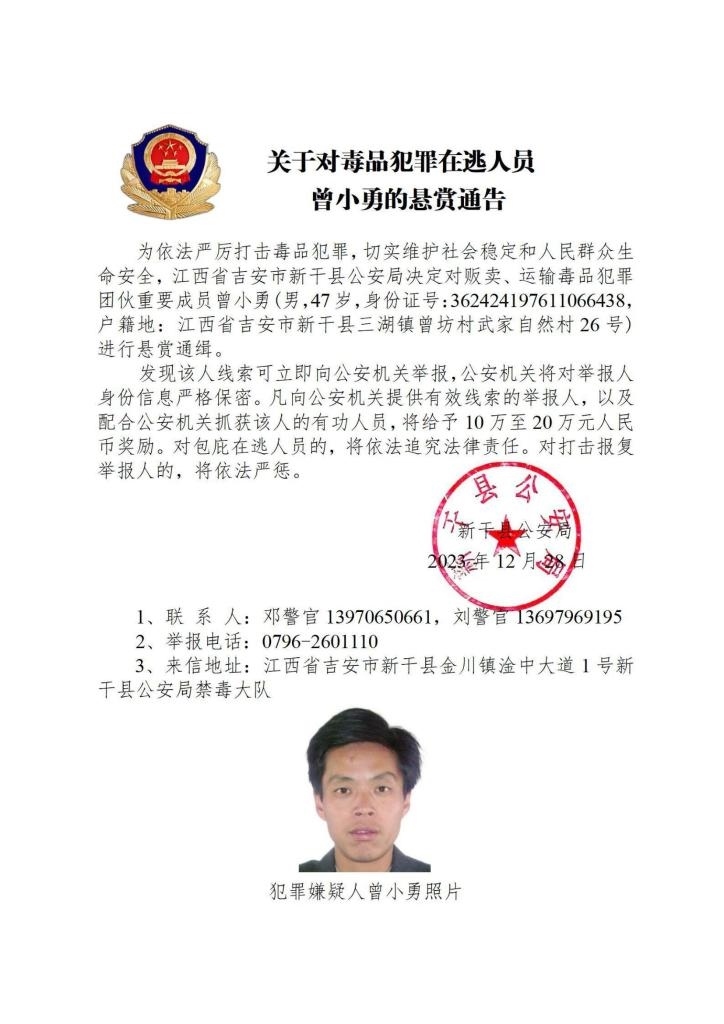新華社北京12月28日電(記者熊豐)記者28日從公安部獲悉,為進一步依法嚴厲打擊緬北地區(qū)毒品犯罪,全力遏制境外毒品向我滲透內(nèi)流,切實維護人民群眾生命健康和財產(chǎn)安全,各地公安機關(guān)在充分掌握相關(guān)犯罪事實和證據(jù)的基礎(chǔ)上,決定對張安龍、曾小勇等10名藏匿在緬北地區(qū)涉毒逃犯進行公開懸賞通緝,力爭早日緝拿歸案,堅決鏟除長期危害我社會穩(wěn)定的境外“毒瘤”。