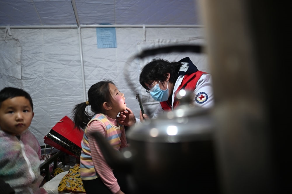 在青海省海東市民和回族土族自治縣官亭鎮(zhèn)喇家村安置點,山東援青醫(yī)生李鴻皓(右)為喇生婷檢查身體(12月23日攝)。積石山6.2級地震發(fā)生以來,在青海省海東市民和回族土族自治縣,當地醫(yī)療機構和援青醫(yī)療隊通過設立醫(yī)療點、開展巡診等方式保障安置點群眾就醫(yī)服務,守護群眾健康。新華社記者 張宏祥 攝