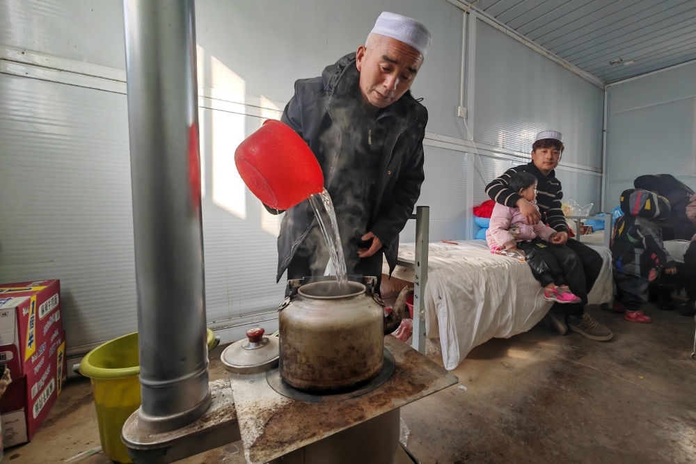 在甘肅臨夏積石山縣大河家鎮(zhèn)梅坡村活動板房安置點,受災村民在活動板房內的火爐上燒水(12月21日攝)。新華社記者 范培珅 攝