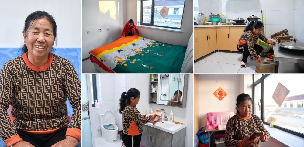 吉林省舒蘭市開原鎮(zhèn)新開村村民徐中仁在新房子中的生活場景(12月7日攝,拼版照片)。徐中仁說,“土炕”變“大床”,WIFI、自來水、室內馬桶一應俱全,新房子讓她體驗上了“城里的生活”。新華社記者 許暢 攝