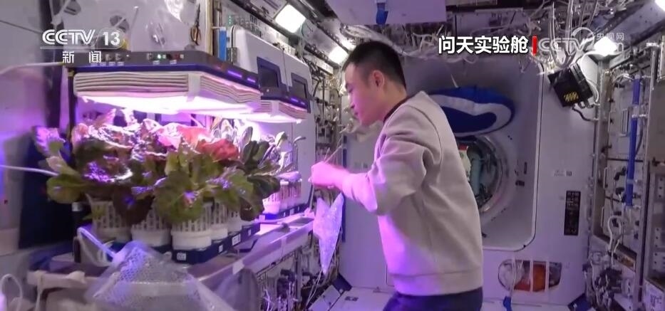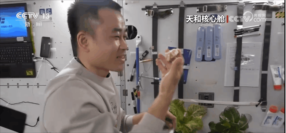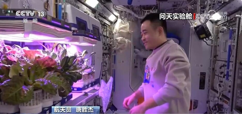 航天員 唐勝杰:你好,我正在對我們的櫻桃番茄進行授粉。因為太空沒有小蜜蜂,我就是那只小蜜蜂。大家看一看,這是我們的太空蔬菜,神十七乘組在“太空出差”期間,我們的太空菜園變得更大了,大家看看我們的蔬菜是不是長勢喜人?今天是新年的第一天,江新林為我們準(zhǔn)備了營養(yǎng)豐盛的太空午餐,但是我覺得今天應(yīng)該再增加一點綠色的、新鮮的蔬菜,午餐就會變得更豐盛了。大家可以看一看,看看我們的櫻桃番茄。誒,拿這兩杯,今天中午我們就吃這兩杯。