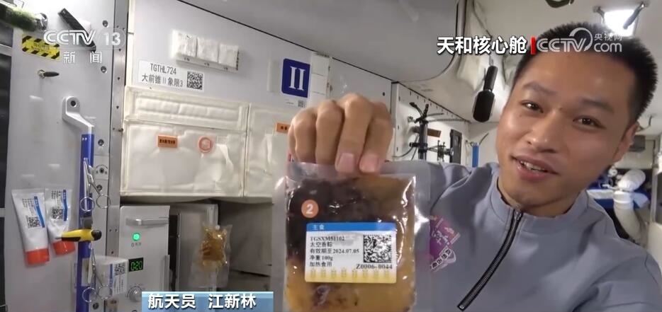 航天員 江新林:我是今天的太空美食家,讓我?guī)ьI(lǐng)大家一起來探索發(fā)現(xiàn)今天的太空美食。我們先看一下主食,熱乎乎的,看看里面都有什么吧,有01最愛吃的白米飯,小心燙哦,02愛吃的面條,我的炒飯。好了,把它粘在餐桌上。然后再讓我們看看我為他們準(zhǔn)備的驚喜??纯催@是什么?這是我們冬至特意結(jié)余的餃子,還有蔬菜副食。地面上的工作人員考慮得特別周到,按照個人的口味為我們準(zhǔn)備了美味的食品,而且將它們塑封包裝,給我們節(jié)余時間的時候又保證它的口味。這是網(wǎng)紅太空香粽,大家印象比較深刻吧,還有這個年糕也是特別好吃、特別美味,還有紅燴豬排,保證有足夠的蛋白質(zhì)攝入量。很豐盛。請看這里,我們特意留了一些新鮮的水果,看看都有什么吧,有美味的蘋果,還有葡萄,大家這個都特別愛吃,我們?nèi)齻€在一起分享一下。