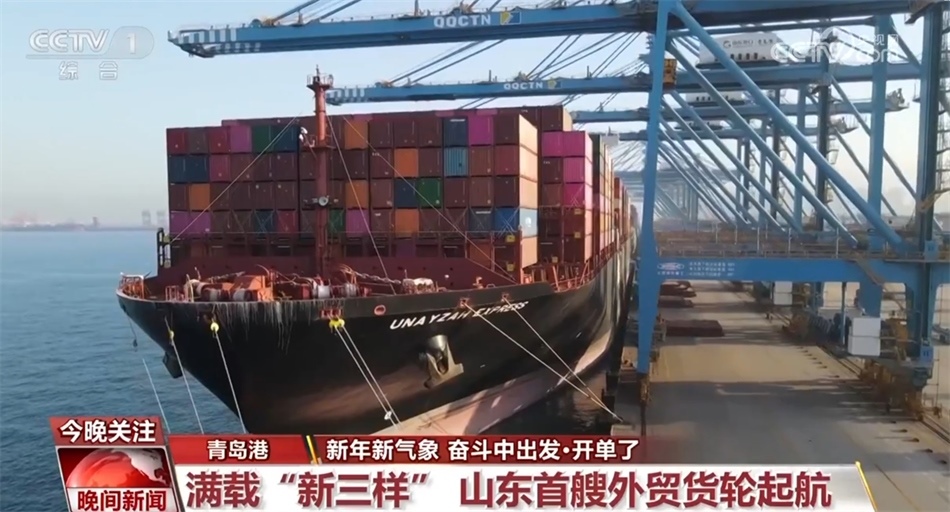 新年伊始,山東首艘外貿(mào)貨輪從青島港起航。3500多個標(biāo)箱里滿載包括電動載人汽車、鋰離子蓄電池、太陽能電池等外貿(mào)“新三樣”,總貨值約2億人民幣。