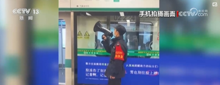 在地鐵站,執(zhí)勤小哥暖心喊話,祝大家新年快樂。