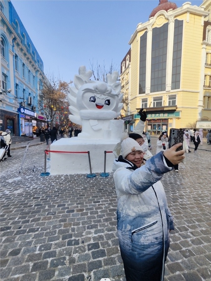 哈爾濱中央大街游客和雪雕合影