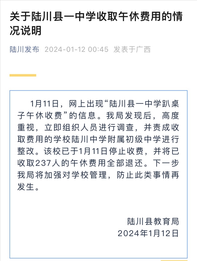 ·廣西陸川一中學(xué)收取“趴桌費”?當(dāng)?shù)亟逃郑贺?zé)成學(xué)校整改,已退還全部費用。