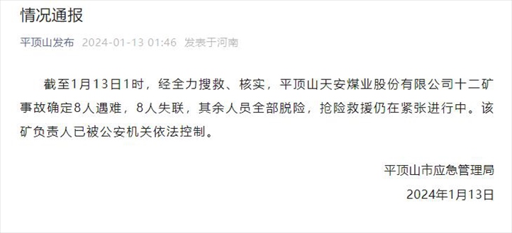 ·河南平頂山煤礦事故已致8人遇難8人失聯(lián),該礦負責(zé)人已被控制。