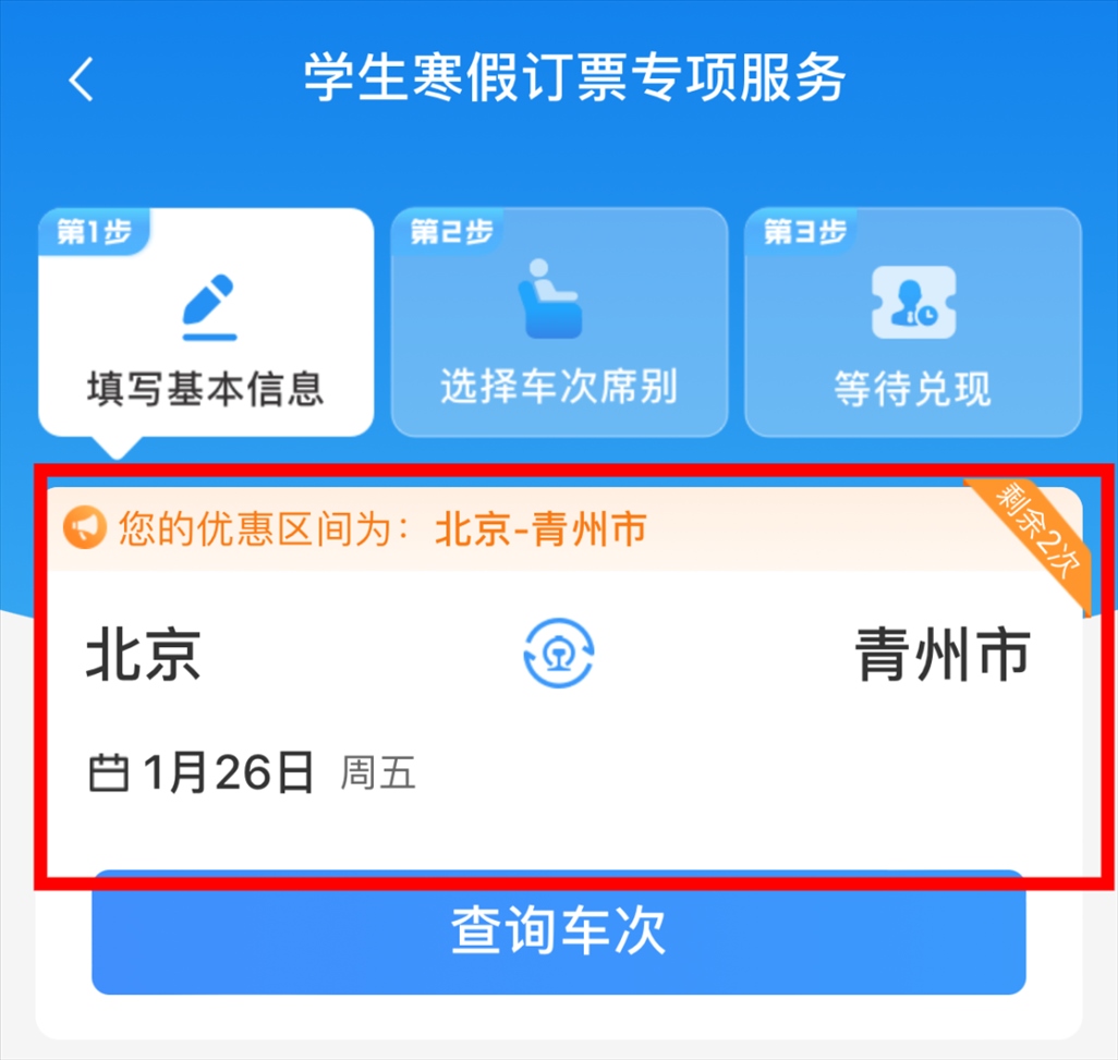 打開(kāi)鐵路12306App,進(jìn)入“學(xué)生、務(wù)工人員春運(yùn)預(yù)約訂票專區(qū)”,點(diǎn)擊“學(xué)生寒假訂票專項(xiàng)服務(wù)”。系統(tǒng)將默認(rèn)填寫優(yōu)惠乘車區(qū)間,并提示剩余優(yōu)惠次數(shù)。