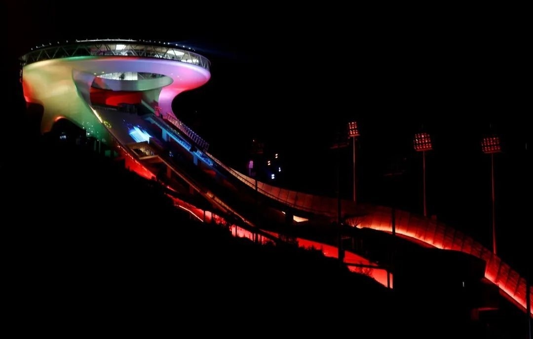 △國(guó)家跳臺(tái)滑雪中心外形如中國(guó)古代象征吉祥的如意,又名“雪如意”。