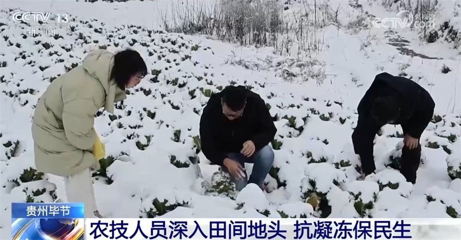 在貴州畢節(jié)螺絲村蔬菜基地,田間地頭白茫茫一片。為應(yīng)對低溫凝凍天氣,當?shù)剞r(nóng)技人員現(xiàn)場查看蔬菜長勢,為農(nóng)戶講解蔬菜防凍知識,指導做好防寒抗凍措施。