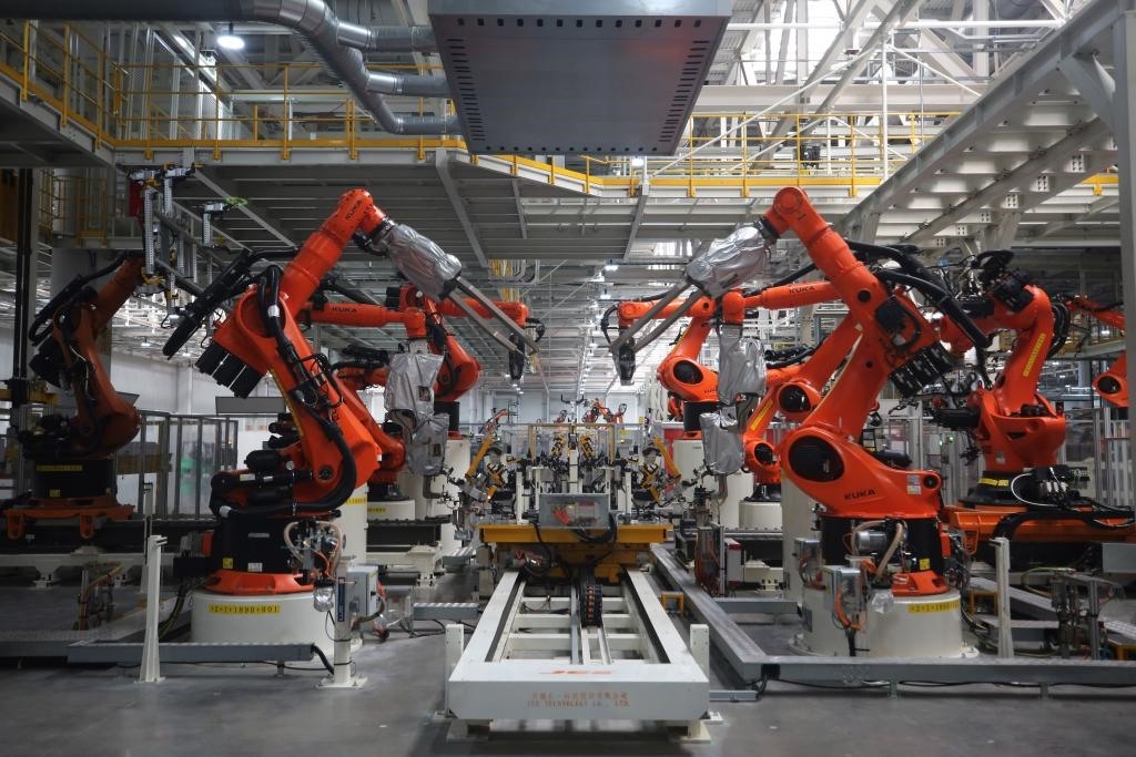 大眾安徽模塊化電驅(qū)動(dòng)平臺(tái)工廠車(chē)身車(chē)間一角。(2023年5月29日攝)新華社記者 杜瀟逸 攝