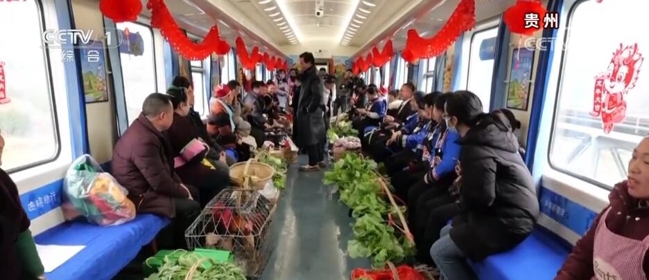 買年貨,除了商超、集市,批發(fā)市場(chǎng),還可以在火車上。在貴州,有一趟往返于貴陽與玉屏之間的“慢火車”5640次列車,里面專設(shè)了一個(gè)農(nóng)特產(chǎn)品車廂。新春臨近,列車上的農(nóng)特產(chǎn)品車廂變得熱鬧起來,村民們將自家養(yǎng)殖的土雞、雞蛋,熏制的香腸、臘肉,以及水果、蔬菜帶上列車,向旅客現(xiàn)場(chǎng)售賣,車廂里喜氣洋洋。