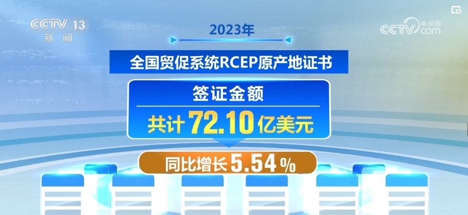 2023年,全國貿(mào)促系統(tǒng)RCEP原產(chǎn)地證書簽證金額共計(jì)72.10億美元,同比增長5.54%;簽證份數(shù)共計(jì)21.81萬份,同比增長38.15%。