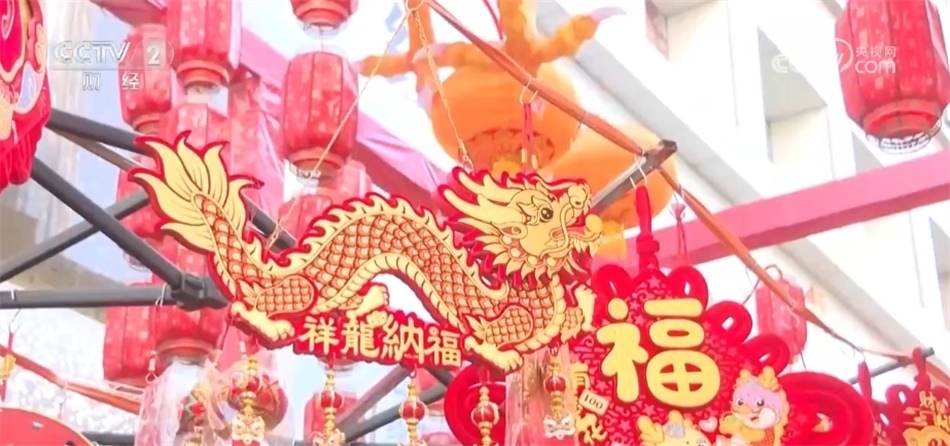 年集現(xiàn)場(chǎng),不少商家還將帶有龍?jiān)氐男履晷∥锛[放在醒目位置,包括福字貼、紅燈籠、龍玩偶、新年擺件等,無(wú)數(shù)個(gè)紅彤彤的小掛件營(yíng)造出濃厚的新年氛圍,吸引不少市民購(gòu)買(mǎi)。