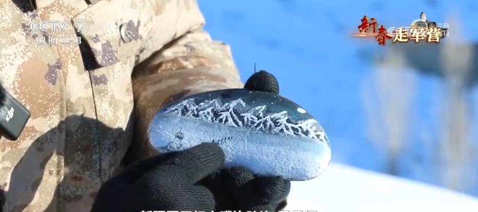 新疆軍區(qū)紅山嘴邊防連 段昱恒:我畫的這塊石頭,這里是我們紅山嘴邊防連的一個哨樓,這里是我們一起來的6名新兵,從哨樓出來準(zhǔn)備去巡邏,前方有冰河,有雪山。在這里我還畫了一條龍,新的一年是龍年,我也希望大家龍馬精神,見龍皆是福。