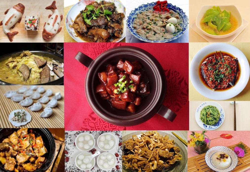 2014年拍攝的拼版照片:“一桌年夜飯”,依次為年糕、發(fā)菜豬手、扁肉燕、長年菜、殺豬菜、餃子、紅燒肉、鴻運當(dāng)頭、安豆苗、臭鱖魚、湯圓、四喜烤麩、八寶飯(從左至右、從上至下)。