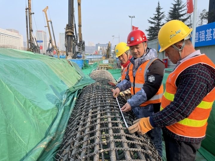 2024年2月9日,在中建八局承建的濟(jì)南軌道交通7號(hào)線一期工程的龍奧大廈站施工現(xiàn)場,質(zhì)量工程師劉學(xué)(中)在檢查鋼筋籠焊接質(zhì)量。新華社發(fā)