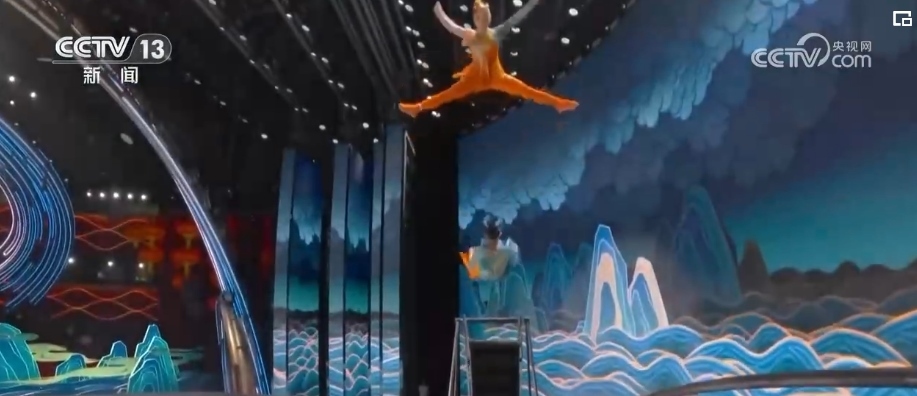 40多年來(lái),春晚劇組首次在1號(hào)廳高空安裝飛人裝置,道具和技巧以及創(chuàng)意的融合,完美演繹了傳說(shuō)中的魚(yú)躍龍門(mén)。