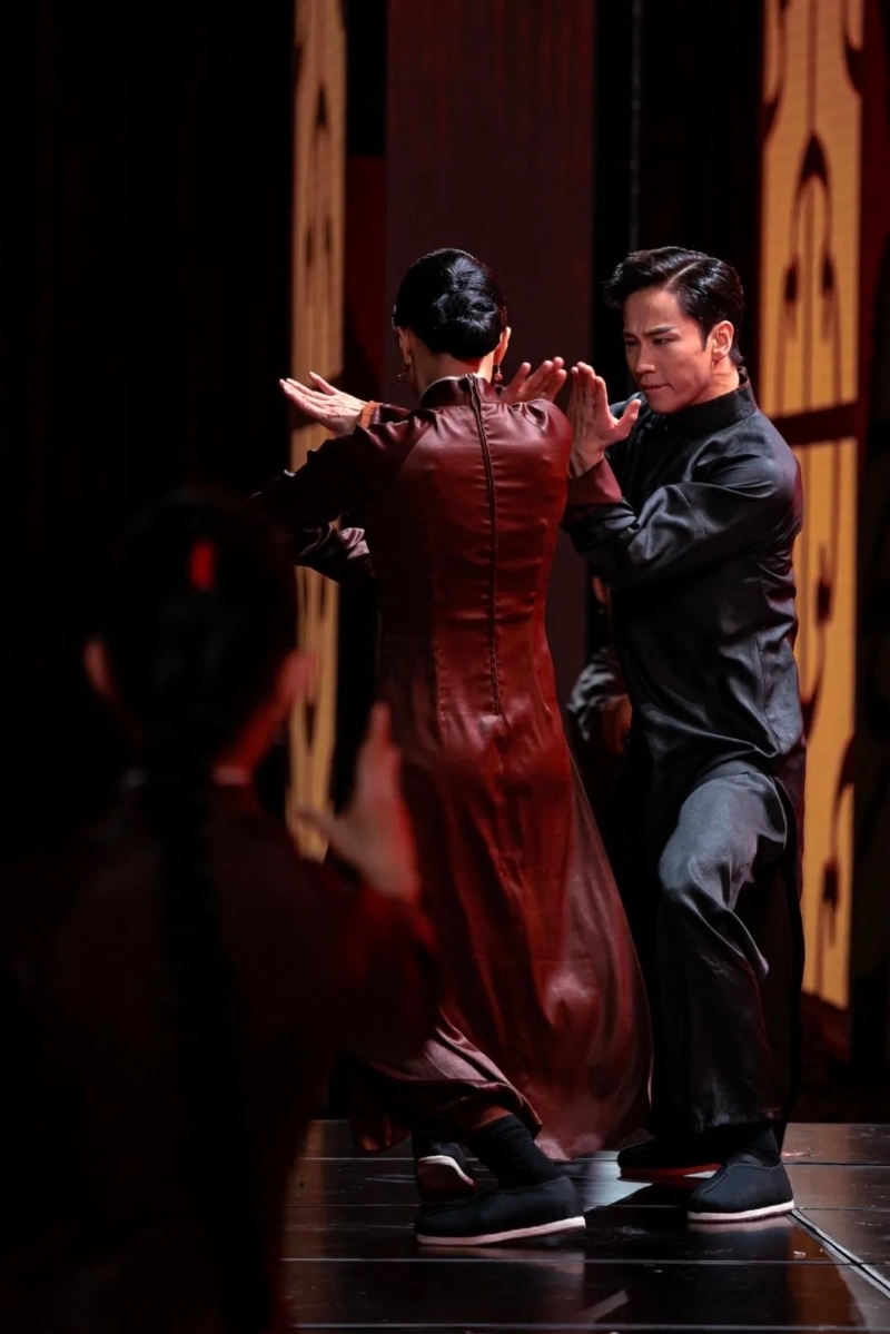 密集的鼓點(diǎn)聲中,一道巨大的人像剪影出現(xiàn)在黃褐色的巨幕上,馬步牢固、拳拳帶風(fēng)。目光正隨著人影挪不開眼,只見一個(gè)騰空飛旋過后,“葉問”同步從屏后翻旋而出,來到臺前。那人那影,一時(shí)間讓人恍惚,什么叫“形影相隨”,什么叫“弄影團(tuán)風(fēng)”,如今就在眼前!