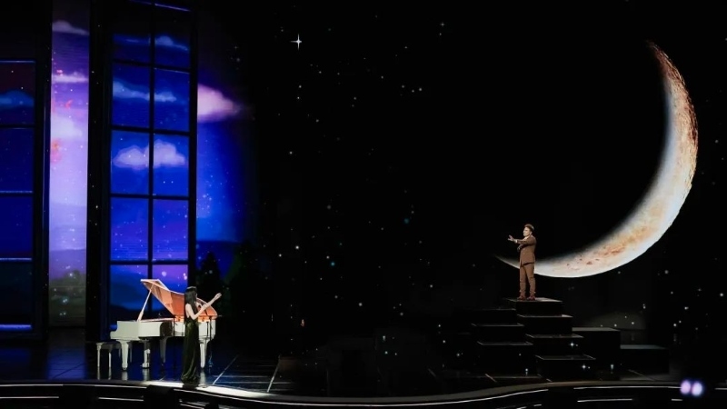 歌詞迅速修改到位,但舞臺的呈現(xiàn)成了讓人反復(fù)琢磨的問題。如何表現(xiàn)“想見卻無法相見”的感覺?如何營造恰到好處的絲絲愁緒?從初次彩排時(shí)用秋千承載思念,到二排時(shí)改用燈光打造“兩個(gè)空間”,幾番嘗試總讓人感覺“還差點(diǎn)兒味道”。最后臺長提議,用“剪影”去暈染思念的情緒,可以考慮用蘇軾的“人有悲歡離合,月有陰晴圓缺”的意境,以月亮為背景。這一下子打開了大家的思路。