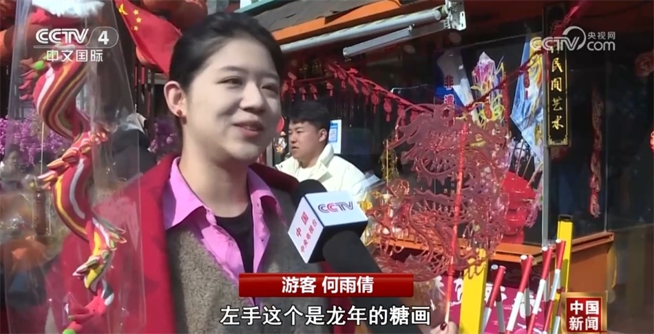 游客何雨倩在接受記者采訪時(shí)說(shuō):“逛廟會(huì),過(guò)大年,今天最大的驚喜就是看到了這么多的非遺項(xiàng)目,我右手這個(gè)是龍年的生肖面人,左手這個(gè)是龍年的糖畫,特別適合打卡,真是太有年味了?!?/p>