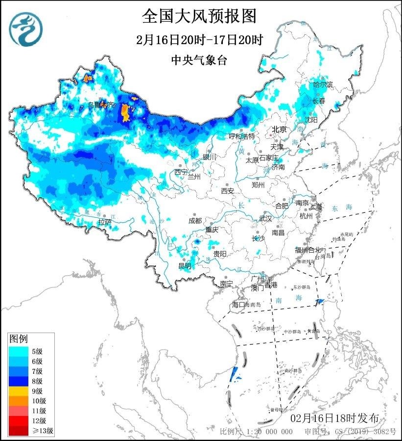 中央氣象臺2月16日18時發(fā)布大風藍色預警。