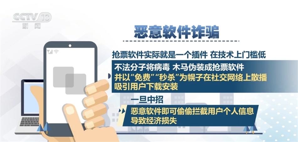 惡意軟件詐騙:搶票軟件實際就是一個插件,在技術(shù)上門檻低,不法分子將病毒、木馬偽裝成搶票軟件,并以“免費”“秒殺”為幌子在社交網(wǎng)絡(luò)上散播,吸引用戶下載安裝。一旦中招,惡意軟件即可偷偷攔截用戶個人信息,導(dǎo)致經(jīng)濟損失。