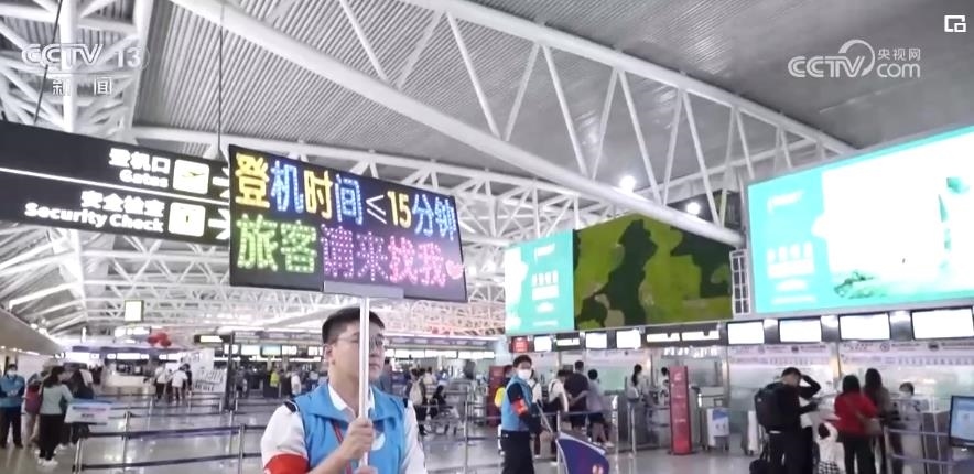 還有15分鐘登機,這在平時不算晚??稍诔醢说某龈鄹叻謇铮绻麤]有志愿者的及時指引,旅客就很有可能錯過飛機。