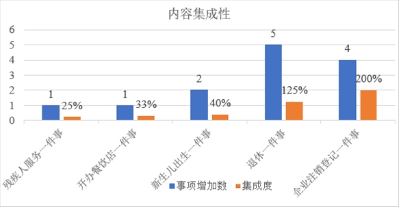 從內(nèi)容集成度看,5項(xiàng)相關(guān)“一件事”的事項(xiàng)集成比例均有不同程度提升?!皻埣踩朔?wù)一件事”增加1個(gè)事項(xiàng),集成度提升25%。“開辦餐飲店一件事”增加1個(gè)事項(xiàng),集成度提升33%?!靶律鷥撼錾患隆痹黾?個(gè)事項(xiàng),集成度提升40%?!巴诵菀患隆痹黾?個(gè)事項(xiàng),集成度提升125%。“企業(yè)注銷登記一件事”增加4個(gè)事項(xiàng),集成度提升200%。
