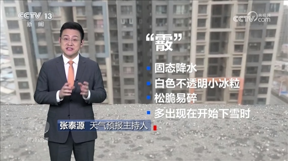 天氣預報主持人張?zhí)┰矗骸啊薄且环N固態(tài)降水,由白色不透明的小冰粒組成,近似球形,有時呈圓錐形,有雪狀結構,通常在地面氣溫不太冷時降落,在剛開始下雪的時候出現(xiàn)?!?/p>